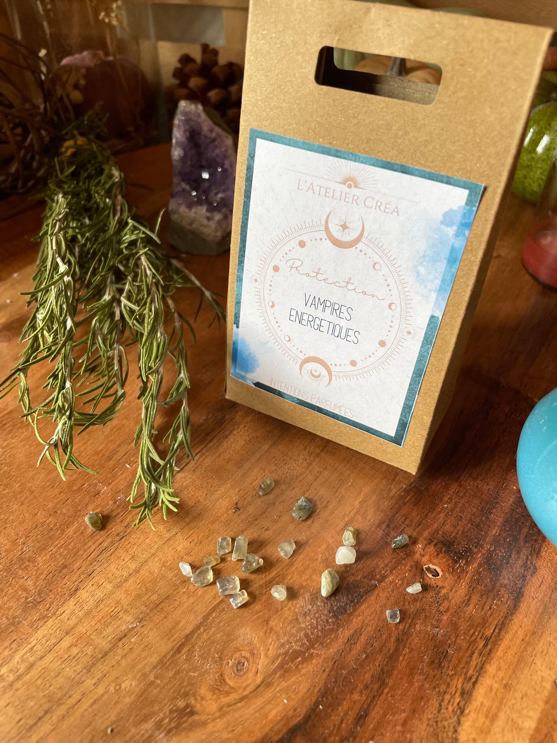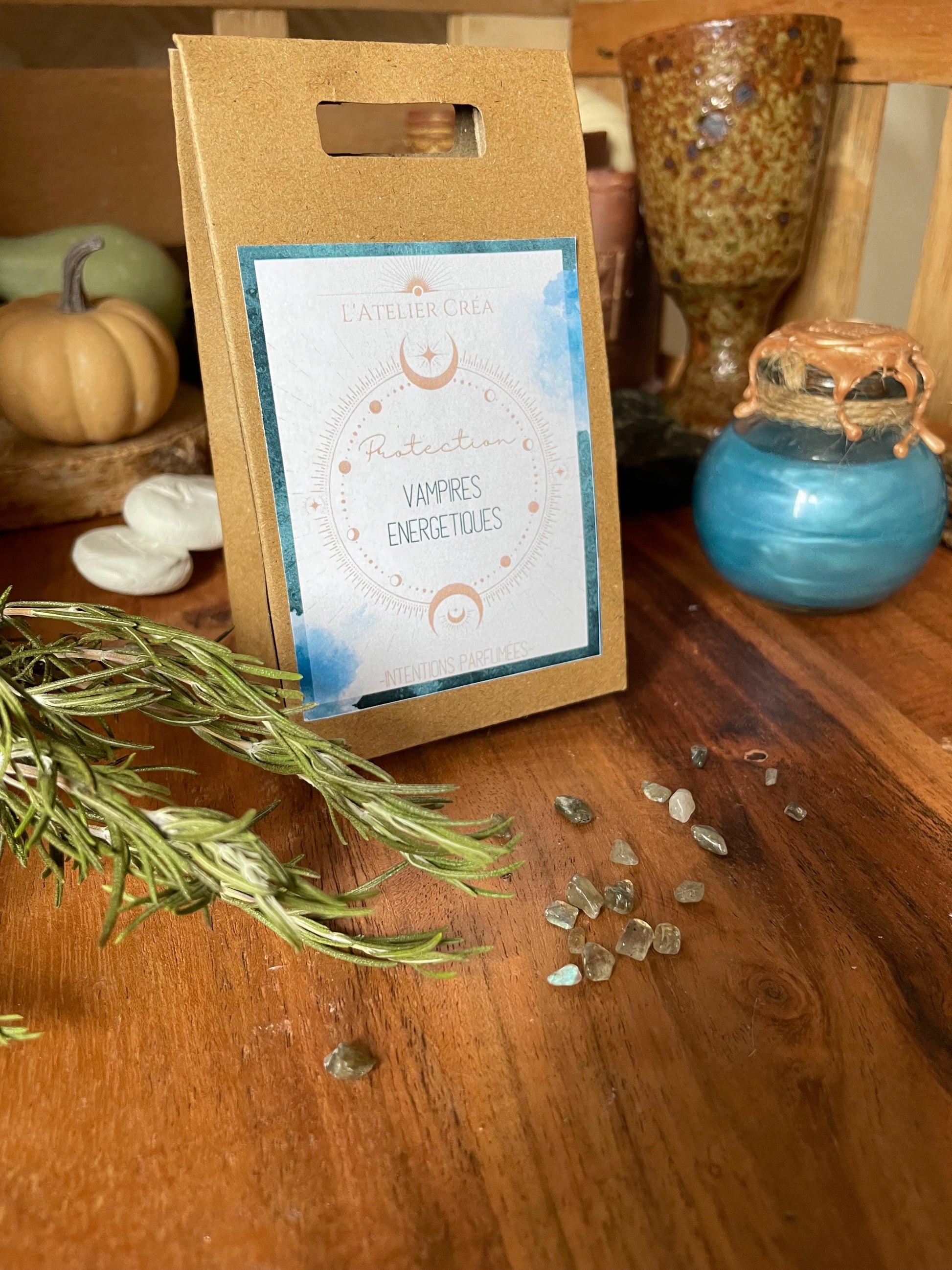 Ils contiennent du romarin, pour ses propriétés purifiantes, ainsi que de Labradorite, pierre associée à la protection contre les énergies lourdes et drainantes.